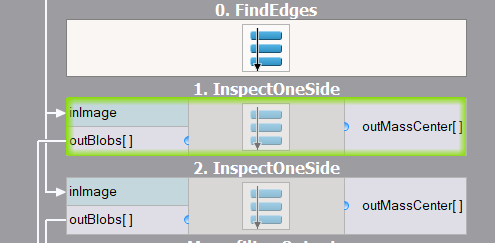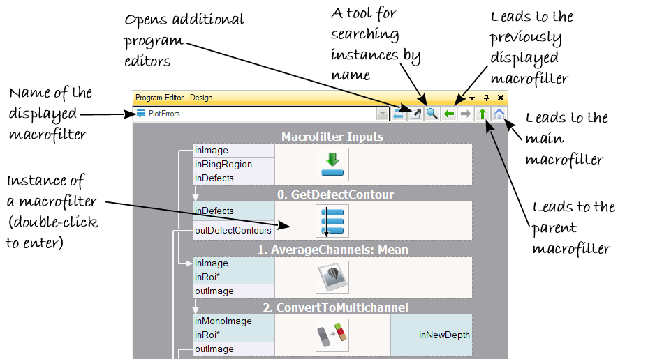 Except for the most simple applications, programs in Adaptive Vision Studio are composed of many so called macrofilters (subprograms). Instances of macrofilters in the Program Editor can be recognized through the icon which depicts several blue bars. Double clicking on an instance opens the macrofilter in the Program Editor.