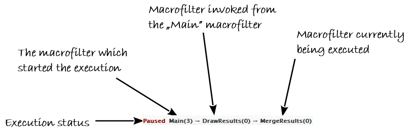 At each moment of a program execution you can see on the Application Status Bar which macrofilter instance is currently being executed. This is called a call-stack, because not only the name of the macrofilter is displayed, but also all the names of the parent macrofilters.