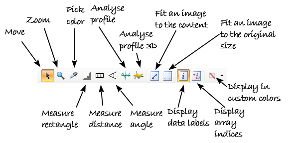 Data displayed in the Data Preview panels can be analyzed interactively. There are different tools for different types of data available in the main window toolbar. These tools depend on currently selected preview which is marked with a yellow border: