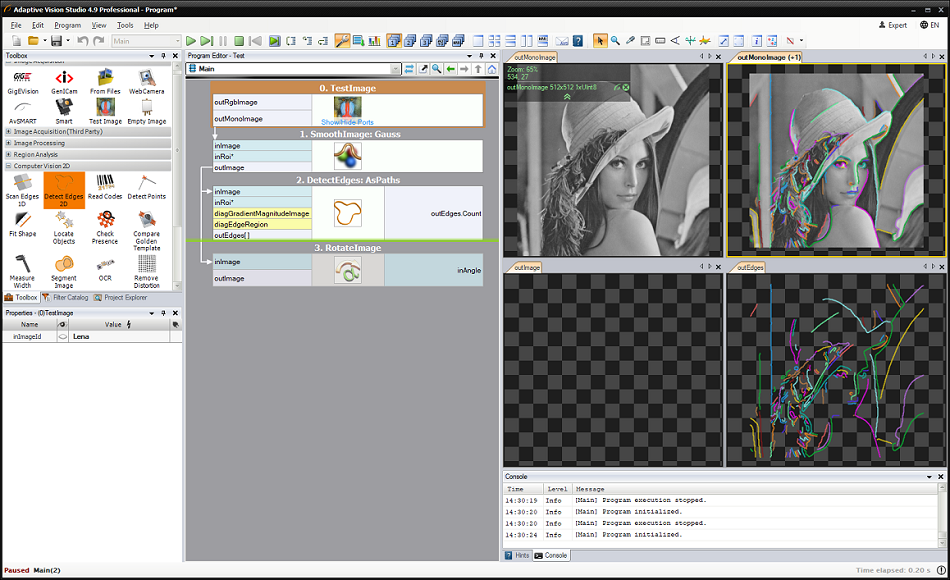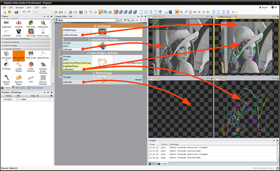 One of the best ways to learn Adaptive Vision Studio quickly is to study the example projects that come with the application. The File » Open Example... command is a shortcut to the location they are stored in. The list of available projects is also available in the Program Examples section.