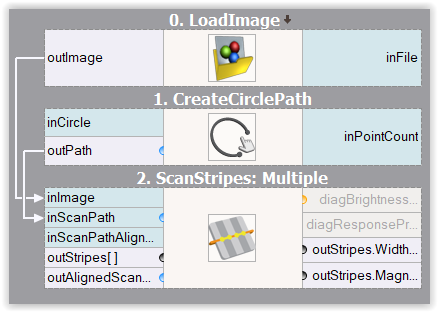 The next step will be to pick a suitable measuring filter. Because the path will alternate between dark blades and white background, we will use a filter that is capable of measuring stripes. As we do not now how many blades there are on the image (that is what we need to compute), the ScanMultipleStripes filter will be a perfect choice.