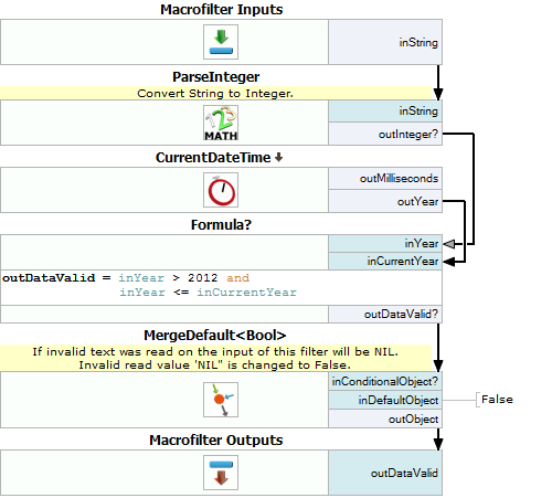 This example consists of two parts. In the first part an input string is converted to an Integer value. The second one checks if year number is valid. The filter ParseInteger was used to convert a text into a number of the Integer type. ParseInteger can return Nil value so MergeDefault filter should be used to decide what is a validation result when invalid year number was provided. Next, the year number is checked using a formula. To get the current year the filter CurrentDateTime is used. If all conditions are met, the validation passes. |