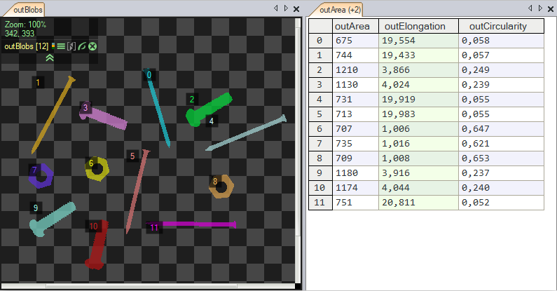 In many applications several objects are analyzed on a single image. Most typically, in one of the first steps the objects are extracted (e.g. as an array of blobs, edges or occurrences of a template) and then some attributes are computed for all of them. In Adaptive Vision Studio the data are represented as several synchronized arrays, with different arrays representing the objects and the individual attributes.