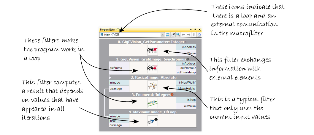 A filter which inserted to a program makes it work in a loop and, like an I/O Function, exchanges information with external elements. Typical examples: WebCamera_GrabImage, GigEVision_GrabImage.