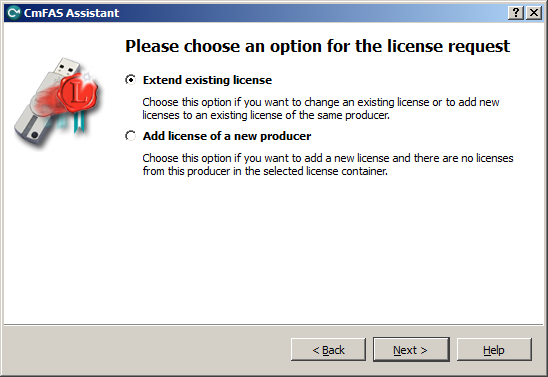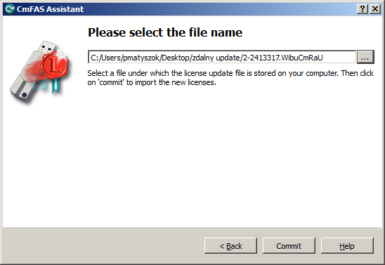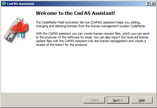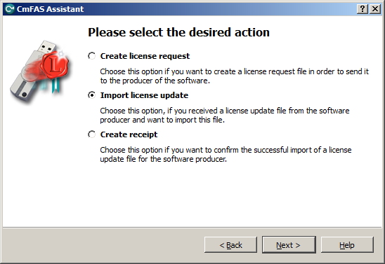 Next step is to choose dongle, that is about to be upgraded and then click on "License Update" button, which will bring CmFas Assistant window: