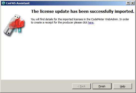 As previously, Control Center needs to be opened by clicking on its icon in tray. Dongle needs to be selected, and "License update" should be clicked. Note that WibuCmRau file can only be used once, and will work only with dongle, from which the corresponding WibuCmRac was created.