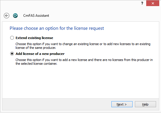 If your dongle happens to be empty (no prior Adaptive Vision license is programmed, and list with available producers is empty), you need to select "Add license of a new producer" option in CmFAS Assistant: