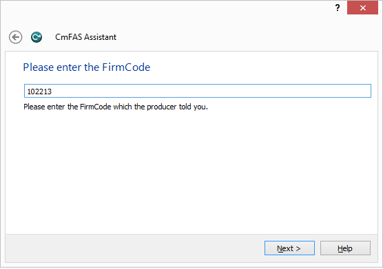 In next window one will be prompted for entering the FirmCode of producer. In case of Adaptive Vision (Future Processing) on should type 102213, as shown on image below:
