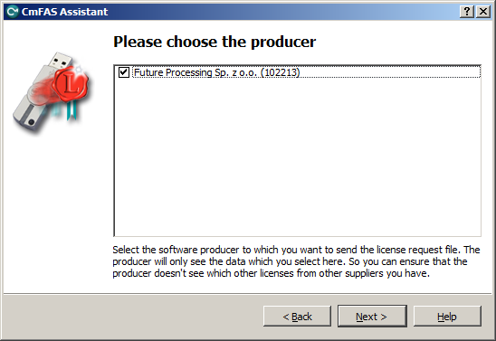 In next window one can choose which producers' license is wanted to be updated. "Future Processing sp. z.o.o." should be selected.