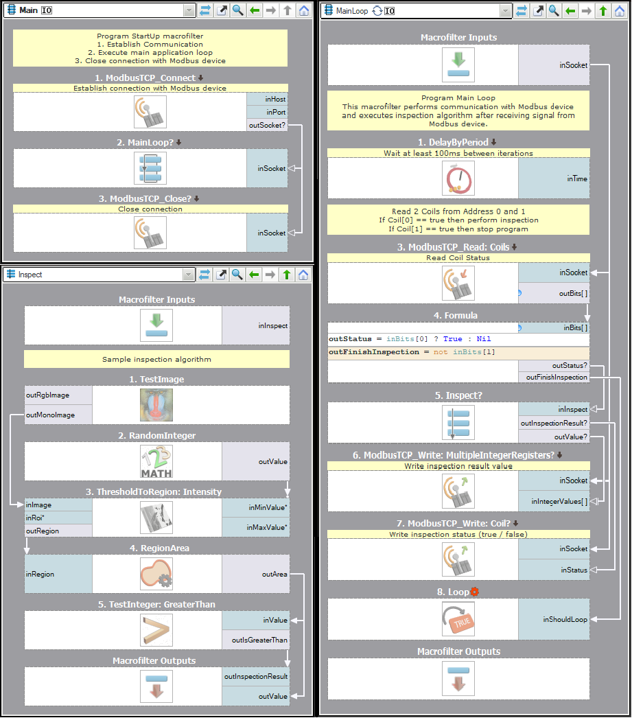 To communicate with a ModbusTCP device, first a connection needs to be established. The ModbusTCP_Connect filter should be used for establishing the connection. The default port for ModbusTCP protocol is 502. Usually, a connection is created before the application enters its main loop and it remains valid through multiple iterations of the process. It becomes invalid when it is explicitly closed using ModbusTCP_Close filter or when an I/O error occurs. The Modbus filters work on the same socket as TCP IP filters. If Modbus device supports Keep-Alive mechanism it is recommended to enable it, to increase chance of detecting a broken connection. For more details please read Using TCP/IP Communication.