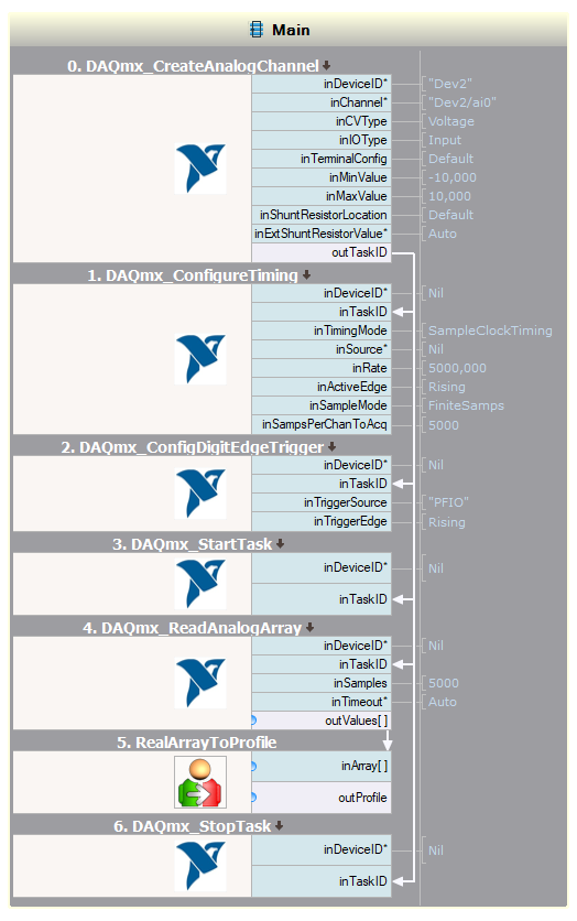 At first, analog channel is created. In this sample, input values will be measured, so inCVType input must be set to Voltage and inIOType should be set to Input. The rest of inputs depends on used device. Afterwards, sample clock to task is assigned. inDeviceID input might be set to Auto, because it is the only one device used in this program. Other parameters could be set according to user's camera. Sample application should start acquiring data after a digital edge occurs. Because an active edge of digital signal should be rising, inTriggerEdge input must be set to Rising (for falling edge, value Falling must be chosen). Task is ready to start. Last step in presented program is to acquire multiple data from selected device. Filter DAQmx_ReadAnalogArray could be used for this. DAQmx_StopTask is not required, because this program doesn't use one channel in two different tasks. Acquired array of values might be represented e.g. as a profile (shown below).
