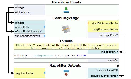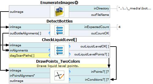 Extract another macrofilter, "CheckLiquidLevel", which takes an image and an alignment on the inputs, and returns the liquid level point and status (ok/not ok). Accept the suggested transformation when using the "Extract Step..." command to assure, that the entire macrofilter is executed multiple times - once for each bottle (as opposed to executing it once for the entire array of bottles).