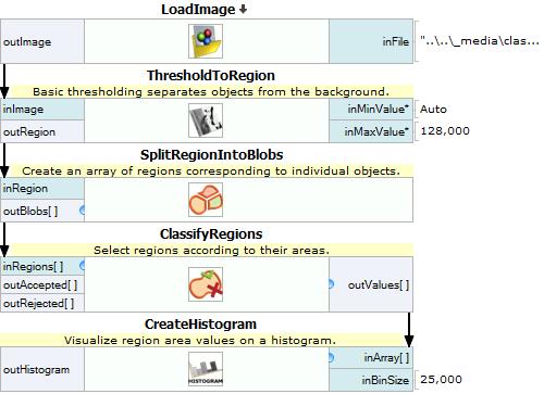 To solve this problem the Blob Analysis technique should be used. This exercise shows one of the typical computer vision problems. To solve this problem ClassifyRegions filter should be used.