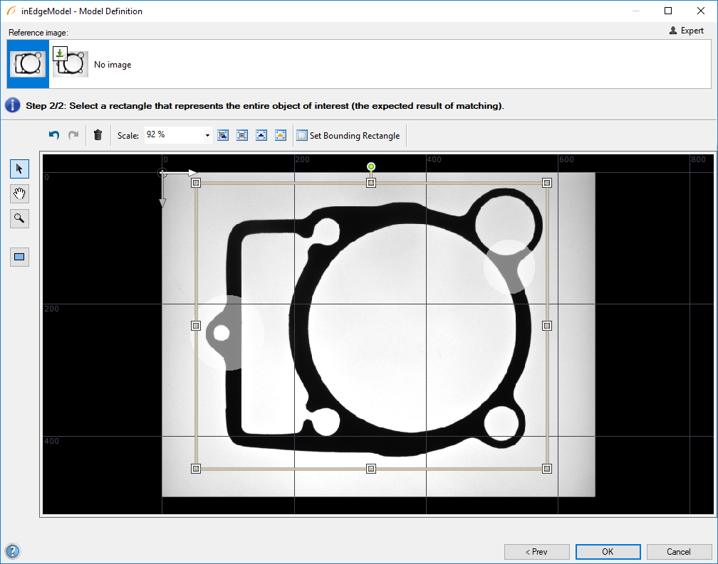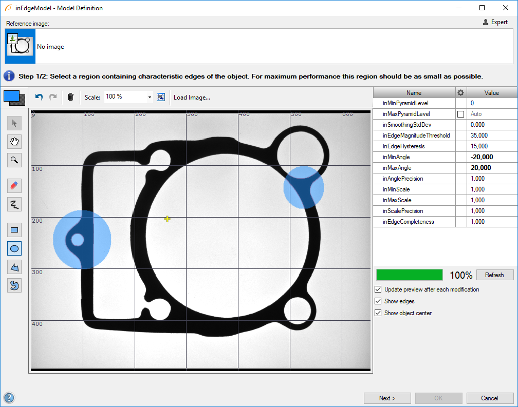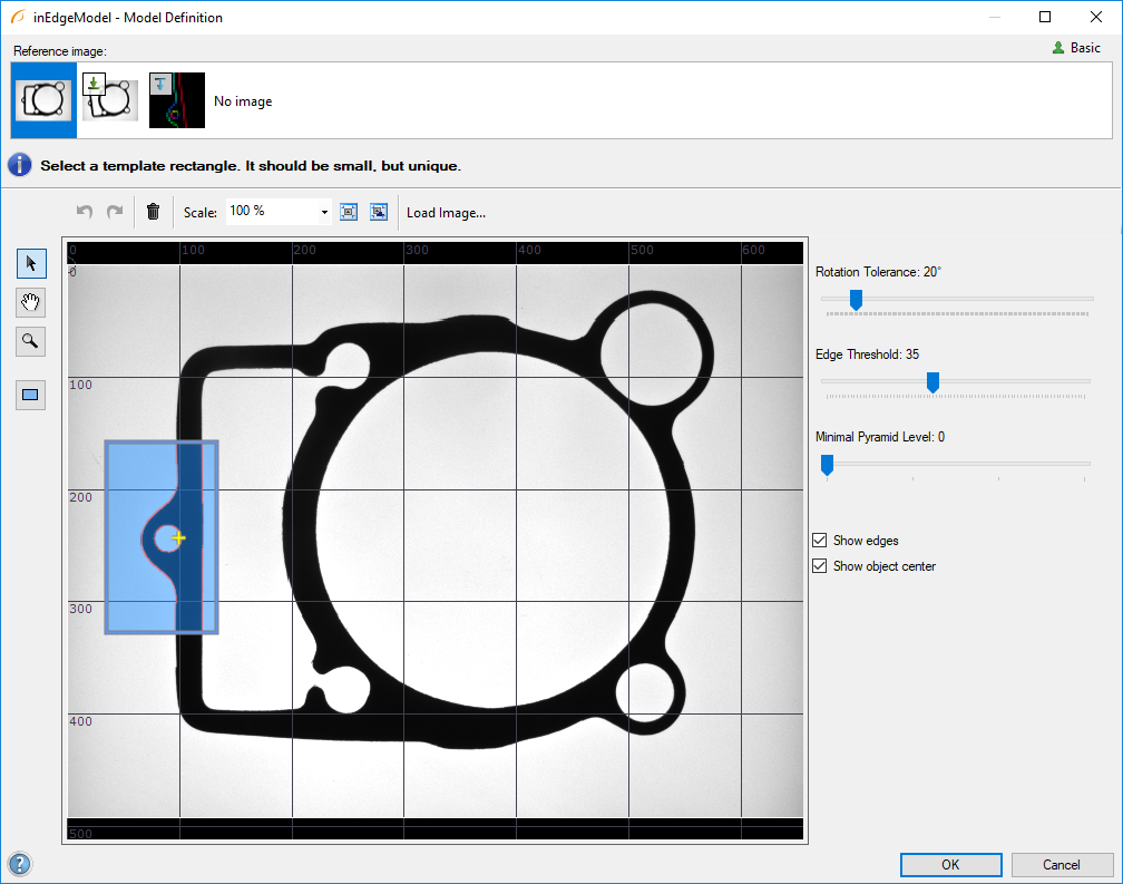 Open a template matching editor on inEdgeModel and select the template region as shown in the picture below. Please note that you can select multiple smaller, separate regions for better rotation detection.