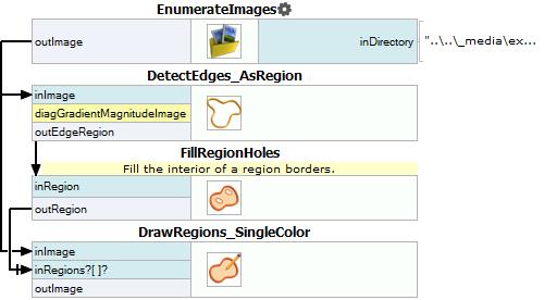 Find the capsule boundaries using DetectEdges_AsRegion filter. Close all discontinuous parts of borders by increasing inStdDevX to 3.0. Filter the selected edges to get only capsule borders by setting inEdgeThreshold to 6.0 and inEdgeHysteresis to 3.0.