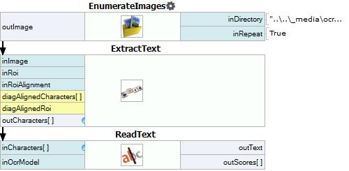 To perform most of the OCR applications two filters are needed. Extracting text from the image can be done using the ExtractText filter. To get textual values from regions the ReadText filter can be used. Both of these filters has a specialized GUI editor which is a convenient way to perform the text reading.