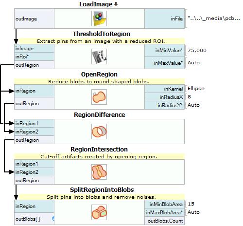 To extract pins from the background, ThresholdToRegion filter can be used. Basic thresholding can be used because the color of pins is much brighter than the dark solder mask.