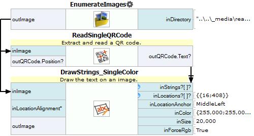 Connect outQRCode.Text output of ReadSingleQRCode filter to inStrings input of DrawStrings_SingleColor filter.