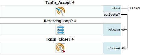 Drag a connection from TcpIp_Accept.outSocket over the instance of the ReceivingLoop macrofilter to create a new input and a connection. Change the input type from "SocketId?" to "SocketId", so that the entire macrofilter is not executed if the connection is not successful.