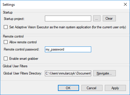 It is possible to use Adaptive Vision Studio to control an Adaptive Vision Executor running on a remote computer, if only the two computers are in the same Ethernet subnet. To enable remote access in Adaptive Vision Executor, the option "Allow remote control" should be enabled. For security reasons, it is also possible to protect connection with a password: