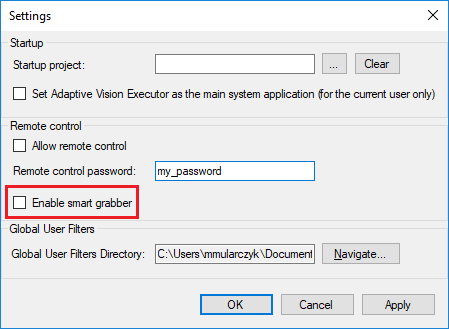 To enable remote image acquisition it is necessary to stop the executor program and enable the "Enable smart grabber" option: