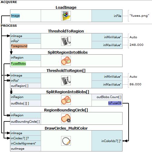 Add ThresholdToRegion filter to create a region containing fuses. A background is white, therefore you can set inMaxValue to 248. Since the PROCESS section should consist of key functionalities of the application, rest of the tools will be placed here.