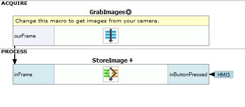 The task of this application is to grab and save an image in certain time, not in every iteration. Therefore ImpulseButton available in the Controls category can be used as a trigger. Connect its output outValue to the StoreImage's macrofilter forking port.