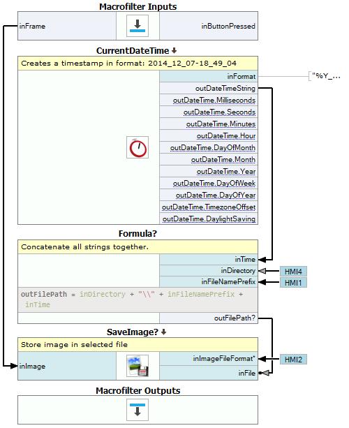 - Add Formula's input inDateAndTime of type String and connect it with the outDateTimeString. Then add another inputs of type String inDirectory and inFileNamePrefix. These inputs will be connected to specific HMI controls, since user has to be able to set a destination directory and a name prefix of file.