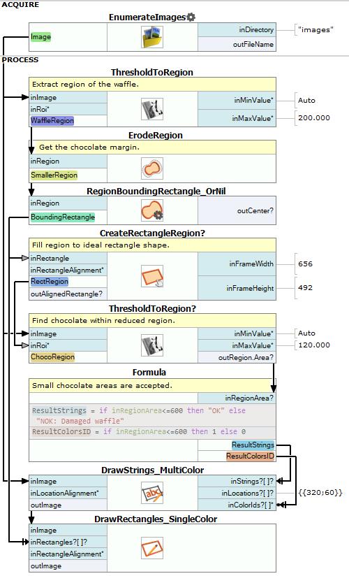 - If you want to threshold the image just in area of the waffle, use ThresholdToRegion again, set inMaxValue to 120, connect inImage with outImage output from the EnumerateImages filter and connect inRoi with outRegion from the CreateRectangleRegion filter.