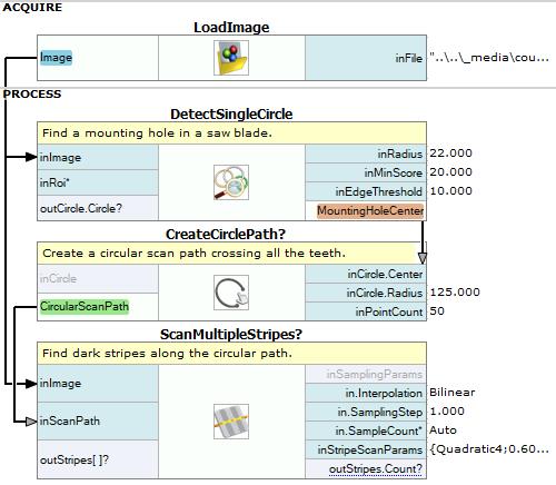 Add CreateCirclePath filter, right-click on inCircle and expand structure fields. Set the value of inPointCount to 50. Connect outCircle.Center with inCircle.Center and set inCircle.Radius to 125 which is the approximate distance between the center of the hole and the teeth of the blade.