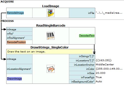 - To draw the recognized value in the image use DrawStrings_SingleColor filter. Set the text position at inLocations and connect outDecodedText with inStrings.