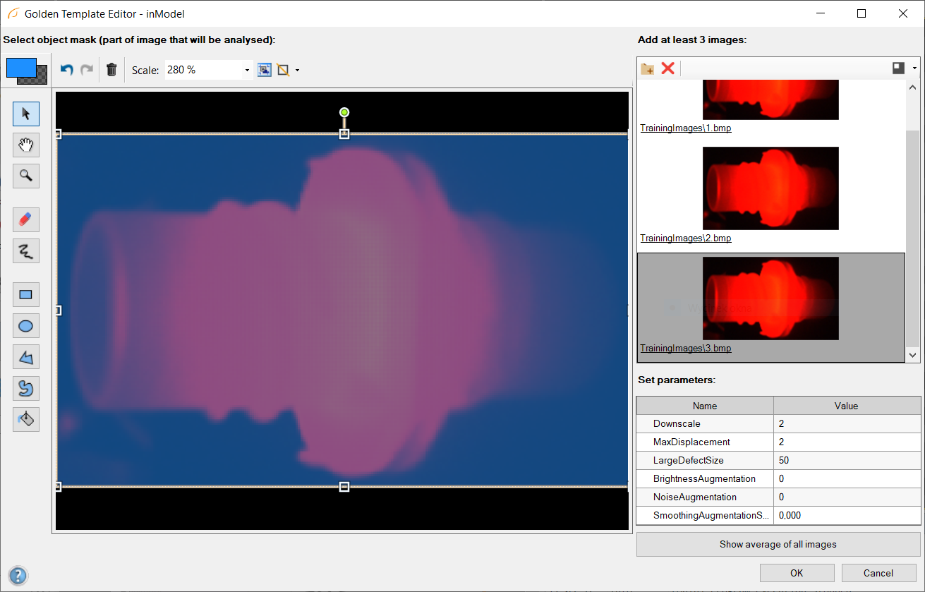 To create a golden template model you need at least three same-sized images representing the same object. The object should be placed in the same way in all the images. Otherwise, the final model may not be accurate enough.