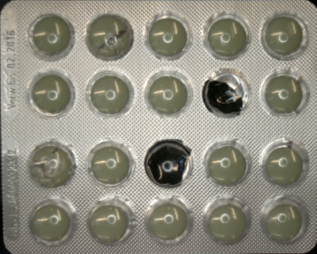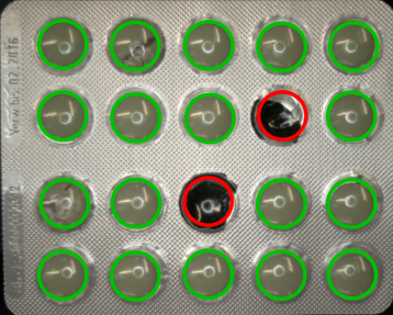 CheckPresence_PixelAmount performed on sample image with inMinAmount = 0.7. The defects are present in red circles.