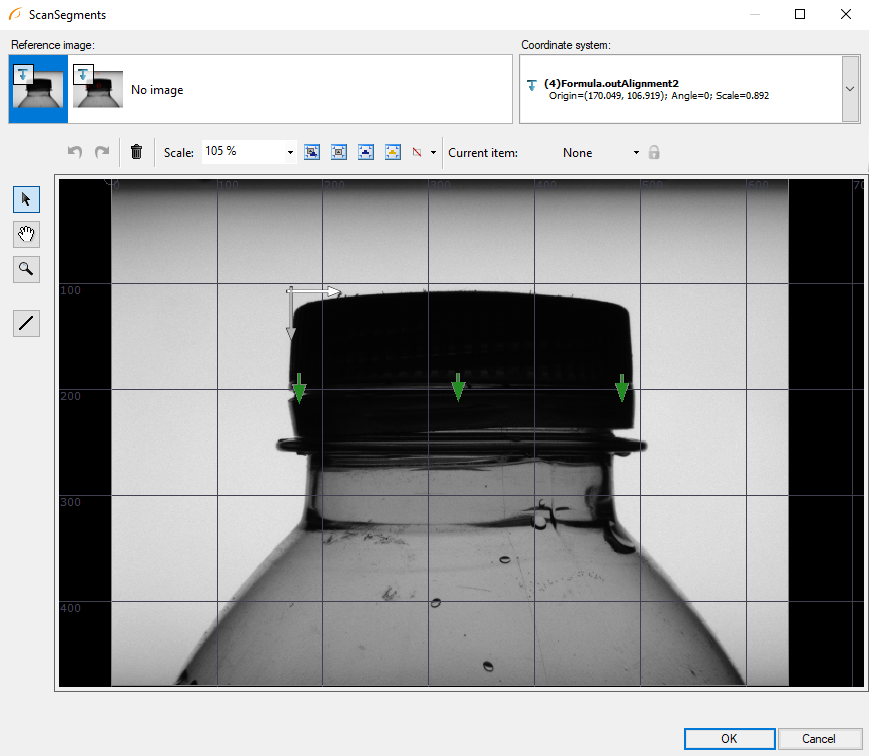 - In the editor first choose the image from EnumerateImages as the reference image. Next set the Coordinate system field to the output of the previously created formula and finally draw a vertical segment intersecting with cap at roughly one fourth of its width. Click OK.