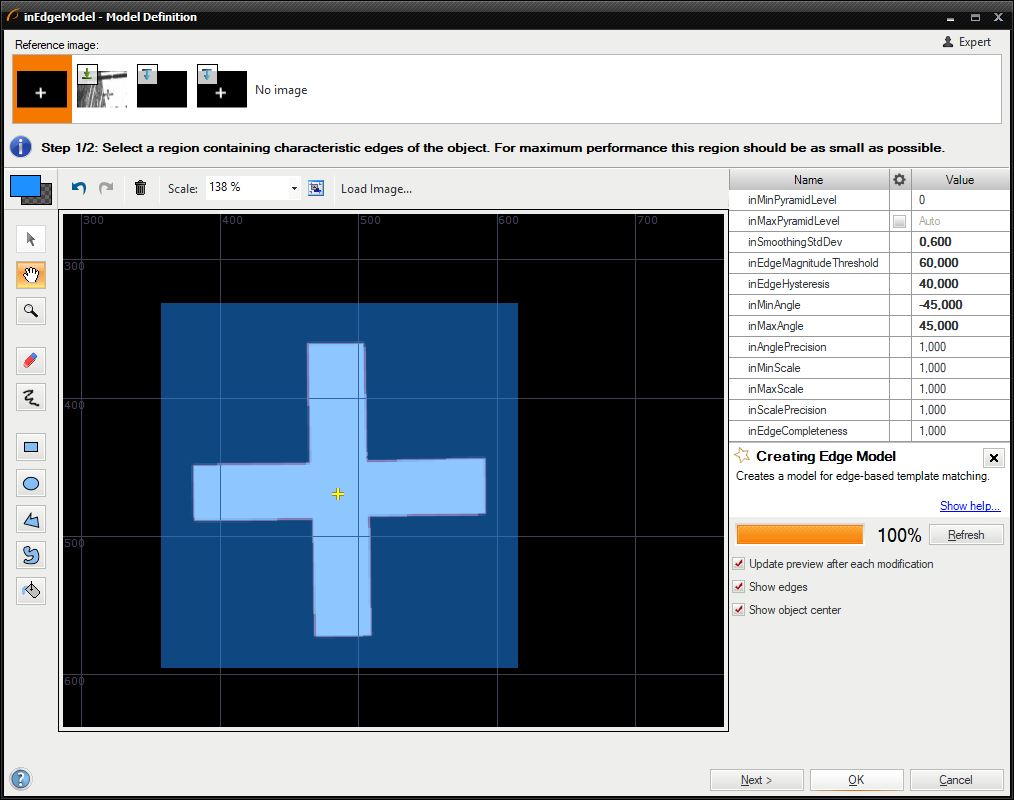 Now the proper part of detection can begin. Add a LocateSingleObject_Edges1 filter. Open the edge editor by clicking the "..." icon in the inEdgeModel field.