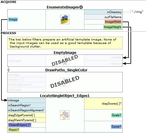 | LocateSingleObject_Edges1 | Detection of an object whose outlines are sharp and rigid. Often one of the first filters in a program. |