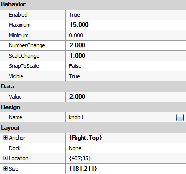 - Knob control available in the "Controls" category. Connect its output "outValue" to inStdDevX input of the SmoothImage_Gauss filter. Make the following changes in the Properties window: