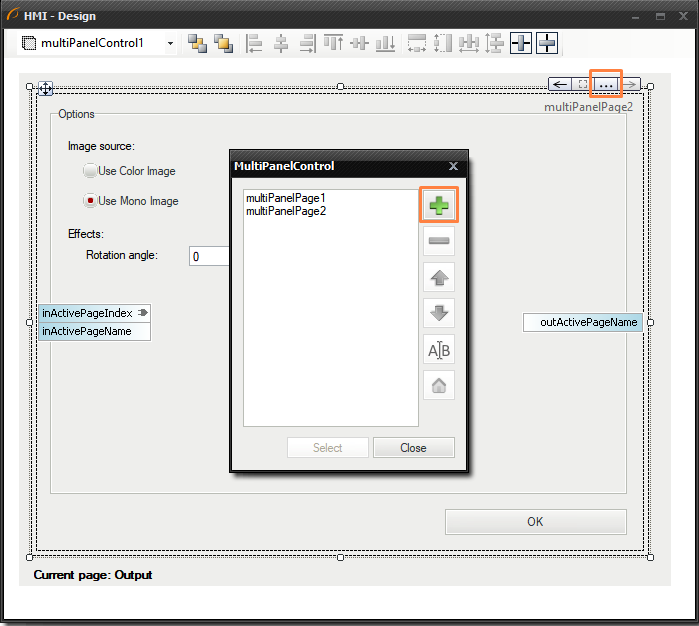 To add a new page into MultiPanelControl, you have to click on the control and press the button shown below. MultiPanelControl window will be prompted immediately. There you can add new pages or delete them: