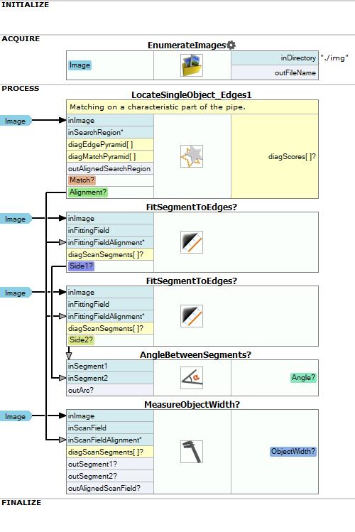 Next, a location of pipe should be found. To perform this task add LocateSingleObject_Edges1 filter. Next connect output image from filter EnumerateImages.