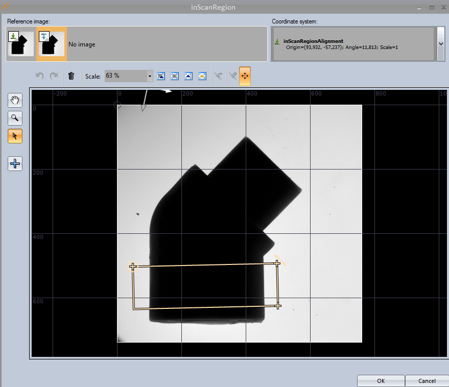 To find L-Pipe width add filter MeasureObjectWidth. Connect inScanFieldAlignment input with output outObject.Alignment of LocateSingleObject_Edges1 and select a scanning field as on the image below.