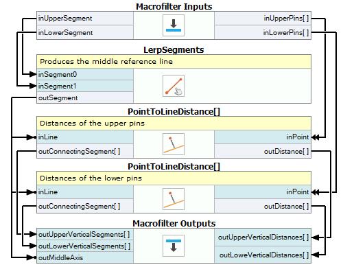 The program calculates distances between consecutive points of one row. Now we need to measure the distance to the center. To find the centerline add a LerpSegments filter. Set its inIgnoreOrientation to True. Connect outConnectingSegments of both the InspectRowOfPins macrofilters to its inputs inSegment0 and inSegment1.