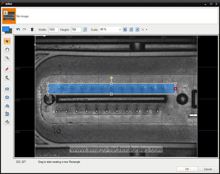 - Now add an ImageLocalMaxima filter and set the inMinValue parameter to 40. In this step we want to measure only the upper row of pins, so click on the "..." icon next to inRoi in the Properties window to open the editor. After that choose the image from EnumerateImages as the reference image (in the top bar of the editor) and draw a rectangle around the upper row of pins (see picture below). Close the editor, drag the outLocalMaxima.Point output to the preview and run the program once again.