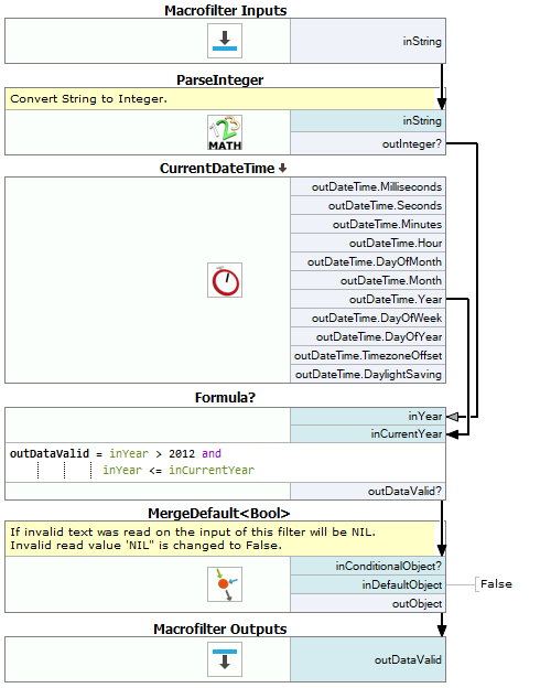 This example consists of two parts. In the first part an input string is converted to an Integer value. The second one checks if year number is valid. The filter ParseInteger was used to convert a text into a number of the Integer type. ParseInteger can return Nil value so MergeDefault filter should be used to decide what is a validation result when invalid year number was provided. Next, the year number is checked using a formula. To get the current year the filter CurrentDateTime is used. If all conditions are met, the validation passes. |