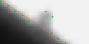 FitPathToEdges performed on the sample image with inMaxDeviationDelta = 2 and inMaxInterpolationLength = 3. Blue points are the points that were interpolated. If inMaxInterpolationLength value was less than 2, the fitting would have failed.