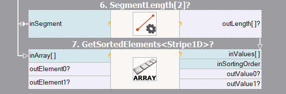 To solve this problem we need to compute an array of the segment's lengths using the SegmentLength filter and then get the appropriate elements with the GetSortedElements filter. This filter will produce the smaller element on the first output and the bigger element on the second output (see the picture below). Alternatively, we could use two separate filters: GetMinimumElement and GetMaximumElement.