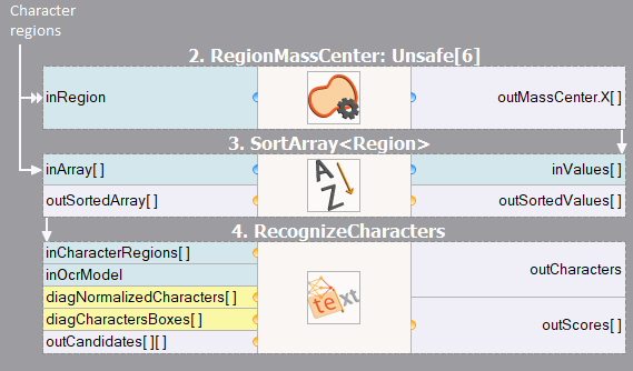 After passing this array of character regions to the RecognizeCharacters filter with the inCharacterSorting input set to None, we will get the result "MAEPXEL", which has all characters recognized correctly, but in a random order.