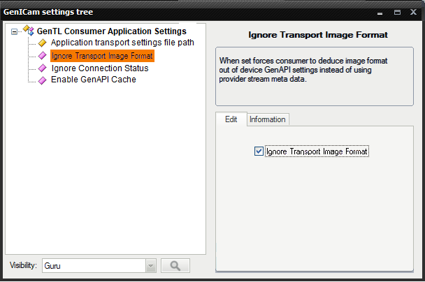 On devices with early version of the firmware, there are problems with starting image acquisition. The workaround is simple: just set the IgnoreTransportImageFormat setting to "yes". This option is available in the GenICam Device Manager (Tools → Application Settings...):