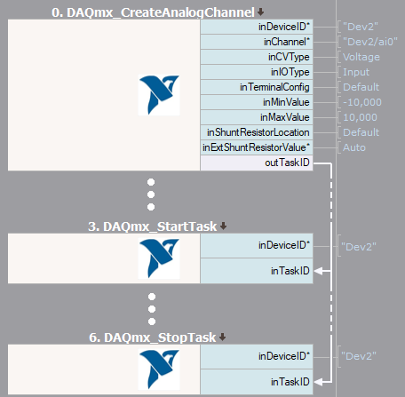 These filters return outTaskID, which is the identifier of a created task. Starting TasksTo start a task, filter DAQmx_StartTask should be used. Finishing Tasks