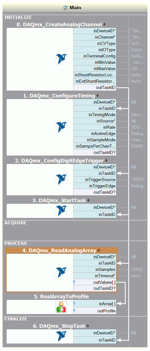 At first, analog channel is created. In this sample, input values will be measured, so inCVType input must be set to Voltage and inIOType should be set to Input. The rest of inputs depends on used device. Afterwards, sample clock to task is assigned. inDeviceID input might be set to Auto, because it is the only one device used in this program. Other parameters could be set according to user's camera. Sample application should start acquiring data after a digital edge occurs. Because an active edge of digital signal should be rising, inTriggerEdge input must be set to Rising (for falling edge, value Falling must be chosen). Task is ready to start. Last step in presented program is to acquire multiple data from selected device. Filter DAQmx_ReadAnalogArray could be used for this. DAQmx_StopTask is not required, because this program doesn't use one channel in two different tasks. Acquired array of values might be represented e.g. as a profile (shown below).