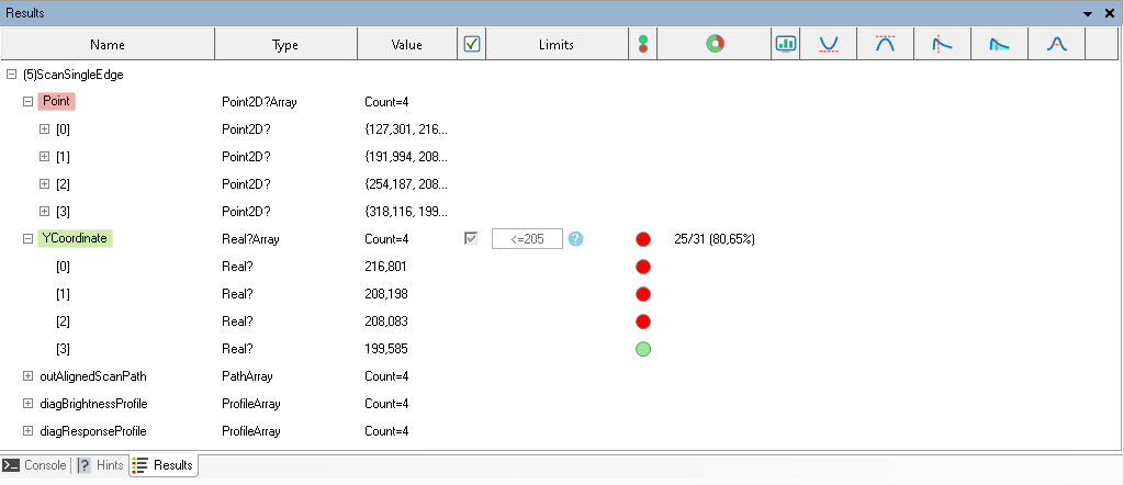 In the image below you can see that at the ScanSingleEdge filter, 25 out of 31 (or 80,65%) bottles detected in the images during the inspection exhibited the Y coordinate value lower or equal to 205. Hover your cursor over the question mark in order to find out what other kinds of criteria can be parsed into the Limits box.